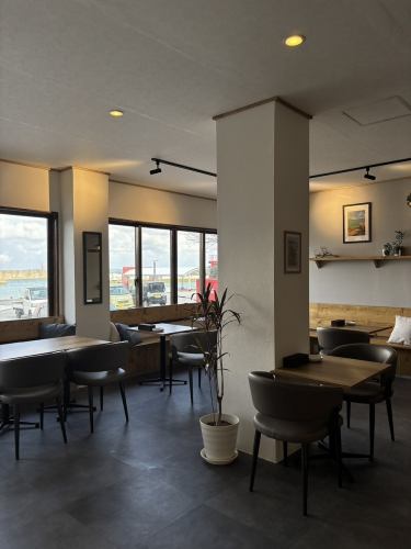 洗練された印象の大きなガラス扉を開けると、そこは光溢れる開放的な空間◎窓の外には佐良浜漁港のパノラマビューと、宮古島の青い空と海が広がります。スタイリッシュな内観と贅沢な景色が織りなす、特別なひとときをお楽しみください♪